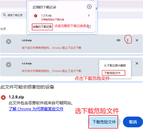 点击网址栏右边下载按钮,如果出现无法下载可以直接选择保留就保留。如若只显示“已屏蔽危险的下载内容”,则按下面的步骤下载即可