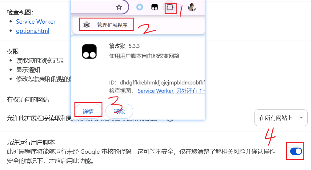 需要注意的是,最新版本的Chrome浏览器默认关闭了篡改猴的允许运行用户脚本,你需要进入管理扩展程序——点击篡改猴详情,然后打开这个开关。